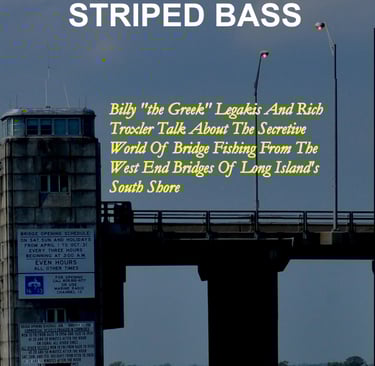 I have also published a 247 page book, the cover of which is shown on the left, that is available worldwide on Amazon and will soon be available at Barnes and Noble. It is a book of stories based on the experiences of myself, and my long time friend, Billy "the Greek" Legakis" during our combined eight plus years of fishing striped bass from the nine west end bridges of Long Island's south shore. I'm also in the process of writing several other books, one on fishing, and a fiction series, (book one of a political action / adventure series).
